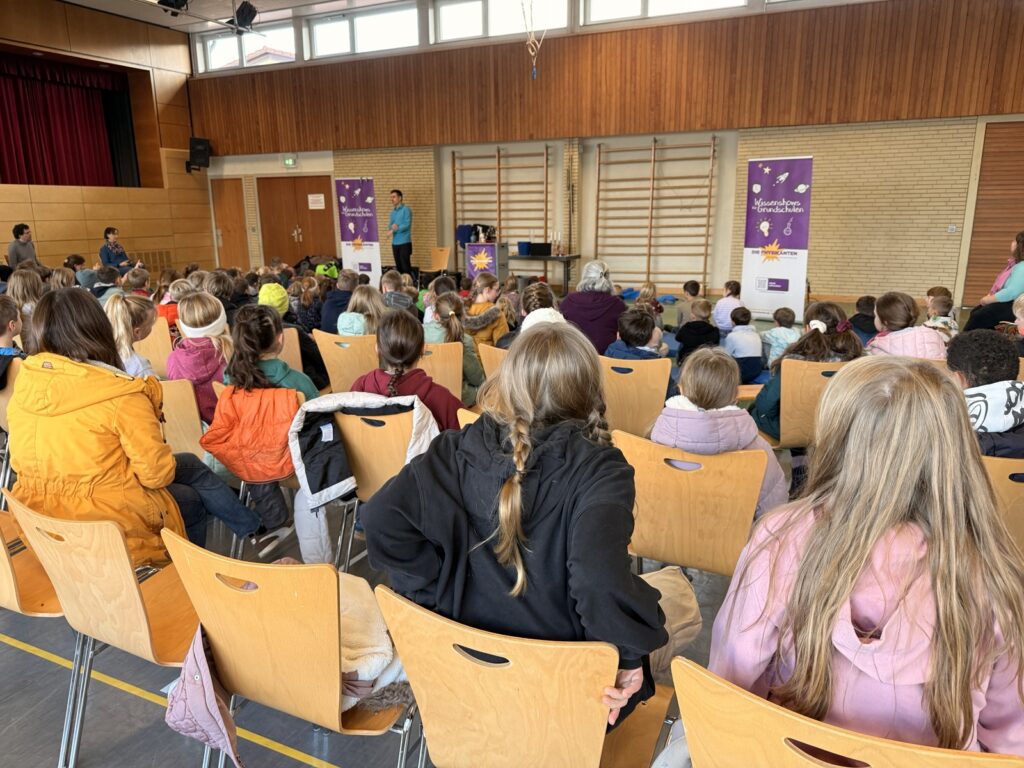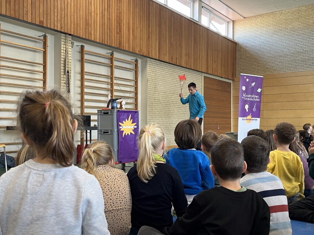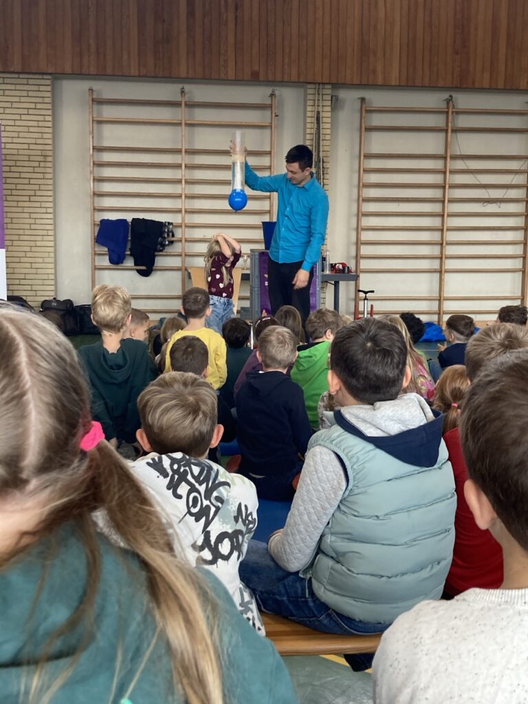 Mit einer spannenden Wissenschaftsshow startete am vergangenen Montag, den 10. November 2025, die diesjährige Projektwoche der Grundschule Eutendorf-Ottendorf. Alle Schülerinnen und Schüler beider Schulstandorte versammelten sich gemeinsam mit ihren Lehrkräften in der Hohbühlhalle und auf dem Pausenhof, um Physiker Chris Blessing live zu erleben.